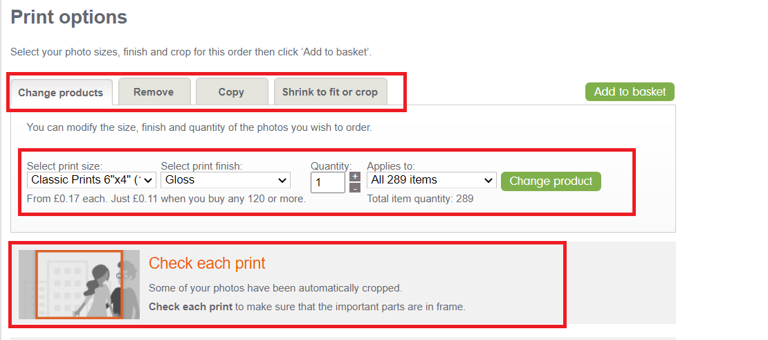 3. On the next page, you can choose the size, finish and quantity of your photos as well as cropp the images, if needed, before placing them in the basket.